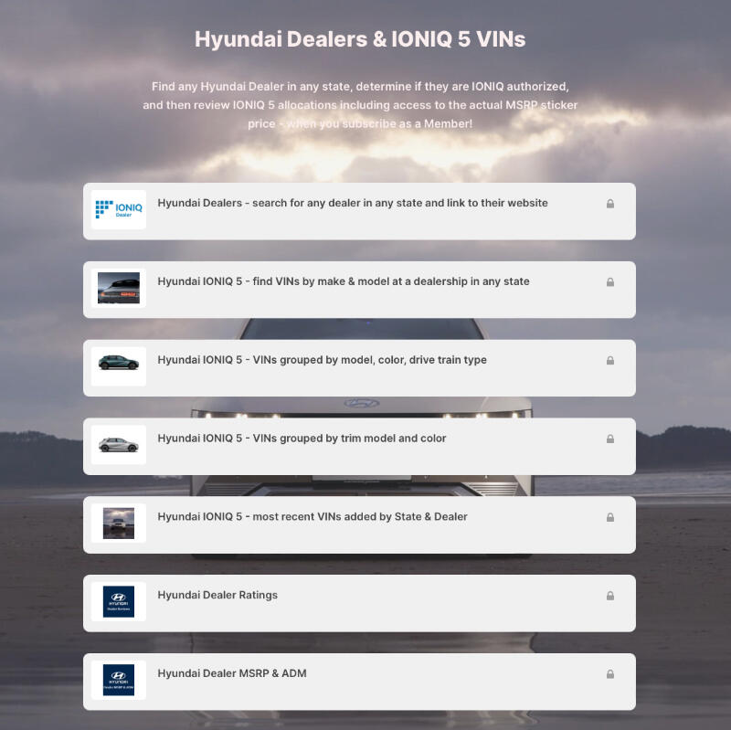 These are the popular EV Makes and Models currently being tracked. Each EV Locator site is available on a subscription basis to members only. You will be able to search and compare specific makes and models across all dealerships. Allocation of VIN numbers and accompanying MSRP window stickers are updated regularly.